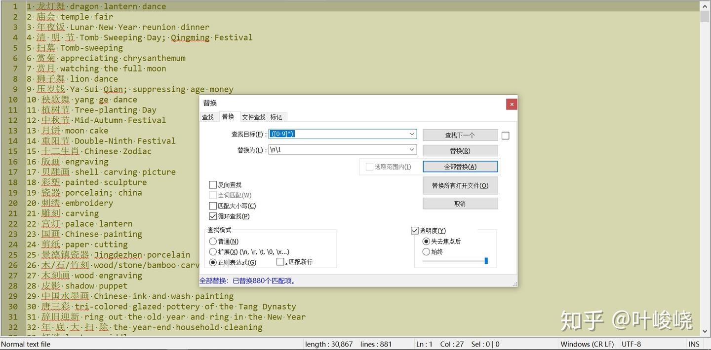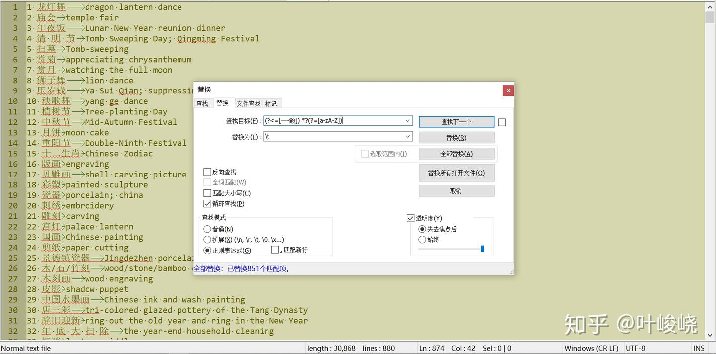 然后到了重要的一步:将中文和英文间的空格替换成特定的分隔符(我以 tab 键为例)