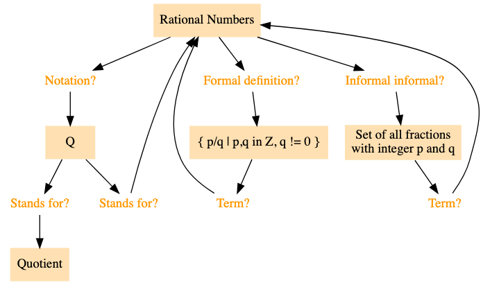 把你正在学习的概念视为一张图谱可能会有所帮助。在这张图谱中,每个节点代表一个具有特定属性的独立概念。而图谱中的边则是引导你从一个概念到另一个概念的问题。