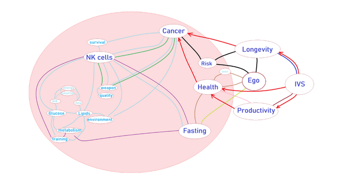 呈现从文章中新习得知识的高度分叉概念图[16]位于粉红色圆形区域。核心价值概念位于右侧白色背景上,它们聚焦于自我和主要生活目标(包括长寿、生产力等)。红色箭头展示了概念如何在知识估值网络[2]中向其他概念传递价值。一条知识的价值是通过与终极目标[18](IVS)的关联而形成的。IVS 赋予健康、长寿和生产力价值,这反过来使得抗击癌症变得重要。而这条新信息揭示了禁食可以训练 NK 细胞,从而增强人体对癌症的自然抵抗能力。