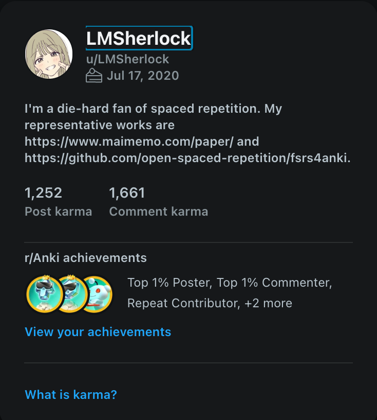 因为在 Anki 的 Reddit 上反响强烈,还成了 Top 1% 的发帖者和评论者: