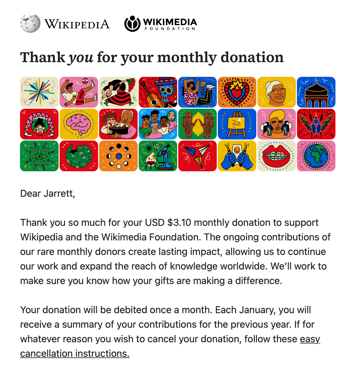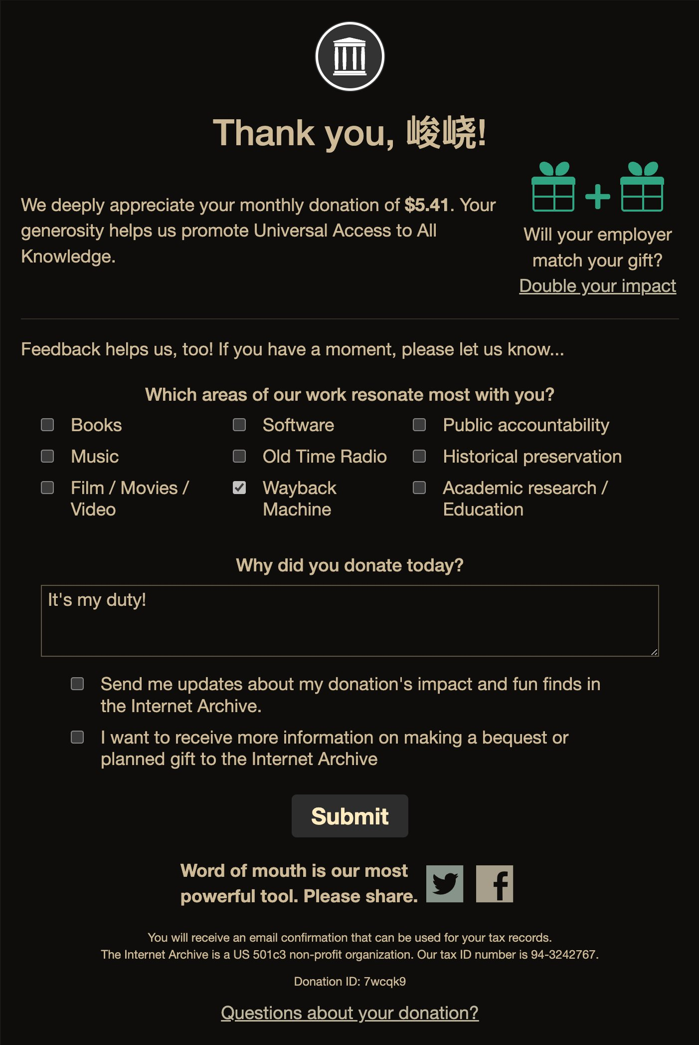 给 Wikipedia 和 Internet Archive 捐了点小钱: