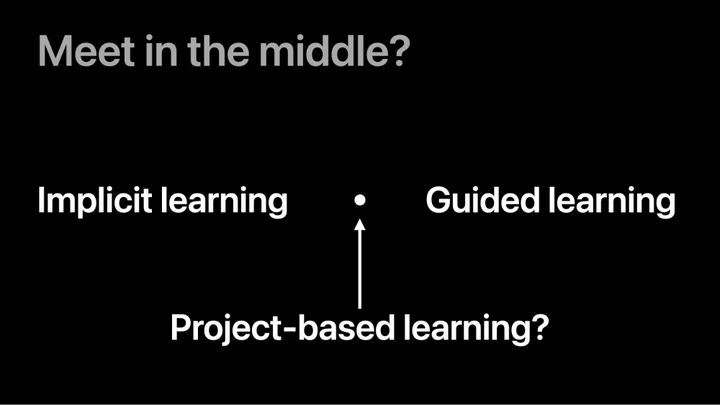 一个显而易见的方法是尝试折衷。项目式学习(project-based learning)就是一个很好的例子。通过设计一系列带有脚手架的项目,我们希望能获得内隐学习的一些好处——真实性、动机和知识迁移——同时也能保持传统课程中典型的教学控制和认知意识。但结果往往是两头不讨好——既没有激发兴趣和意义,也缺乏足够的指导、解释和认知支持。