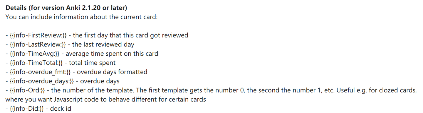 比如,在卡片模板中加入{{info-TimeAvg:}}可以在卡片上显示本卡的平均复习时间。
