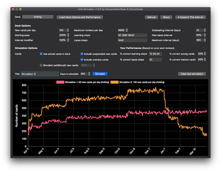 还记得《【硬核】参数模拟——每天 40 张新卡片,365 天后我要复习多少?》这篇文章吗?现在已经有 Anki 插件来预测未来学习情况了!而且能读取任意牌组的卡片数据,使预测结果更精确。