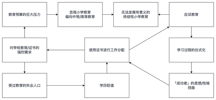 然而,由于教育系统成功传播了「人基本上分为三类:接受初等教育者、接受中等教育者和大学毕业生」的观念,许多现有组织都被强行塑造成这种模式。