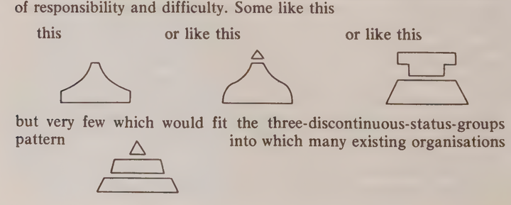 这将是一件极为可贵的事情。当今组织被清晰划分为不同地位群体的方式——文员、执行人员和行政级别;技工、技术员、技术专家;勤杂工、辅助医务人员、医生——这种分层不过是文凭制度弊端的又一体现。它反映的是教育系统的「层级」,而非任何基于功能需要的内在劳动分工。如果我们完全抛开所有成见,纯粹从组织需求出发设计最高效的劳动分工方式,我们会根据组织的具体任务,得到各种各样的金字塔结构,这取决于如何按照工作的责任程度和难度进行排序。