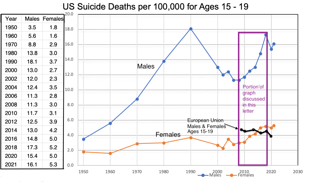 这是我探索美国青少年自杀率变化原因的系列信件的第八封,也可能是最后一封。下方的图表展示了 1950 年至今青少年自杀率的变化情况。