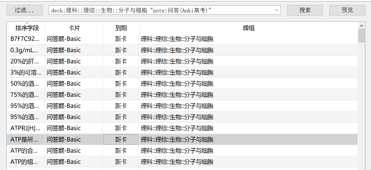 搜索方法:在对应的牌组后面加上 "note:问答(Anki高考)" 即可筛选出该牌组中所有的 问答(Anki高考) 卡片。