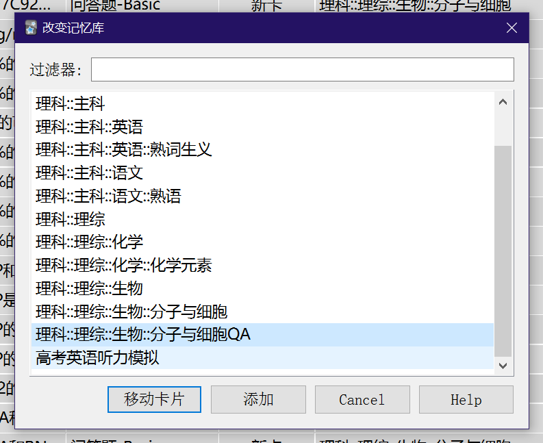 将选中的卡片更换牌组,这里以 分子与细胞 为例