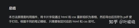 本方法原理是利用插件,将卡片字段通过 html 和 css 重新组织为表格,然后导出后另存为 pdf 便于打印。根据不同的笔记模板,只需要制定对应的 html 和 css 即可。