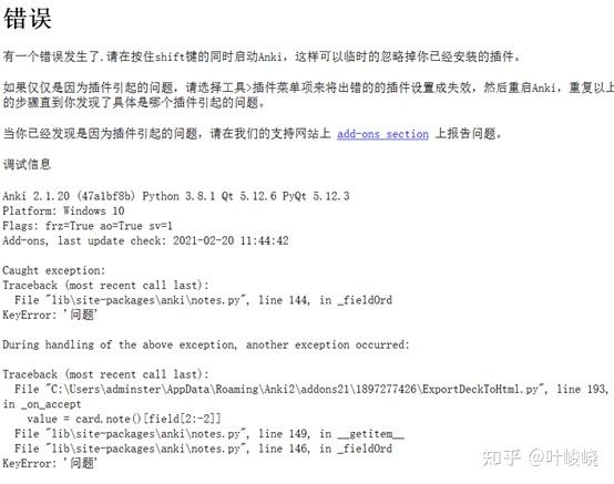 如果出现类似下面的错误,请看看你是否将 html 中的「问题」和「答案」改成你自己卡片模板对应的字段名称。