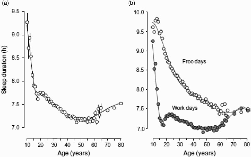图 1. 平均睡眠时长与年龄的关系。(a) 每周睡眠时长的平均值。(b) 周末(空心圆)与工作日(灰点)的睡眠时长。曲线为多项式拟合;垂直线表示平均值的标准误差(± SEM;大多数情况下标准误差大于相应的符号)。© [版权所有者]。经授权摘自 Foster et al. (2013)。