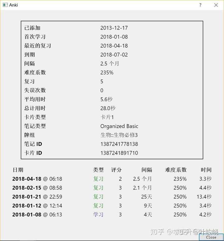 看到了吗?学习 1 次,复习 4 次,间隔就安排到了 2.5 个月之后。而且每次复习的时间很短,我总共花在这张卡片上的时间只有 28 秒。