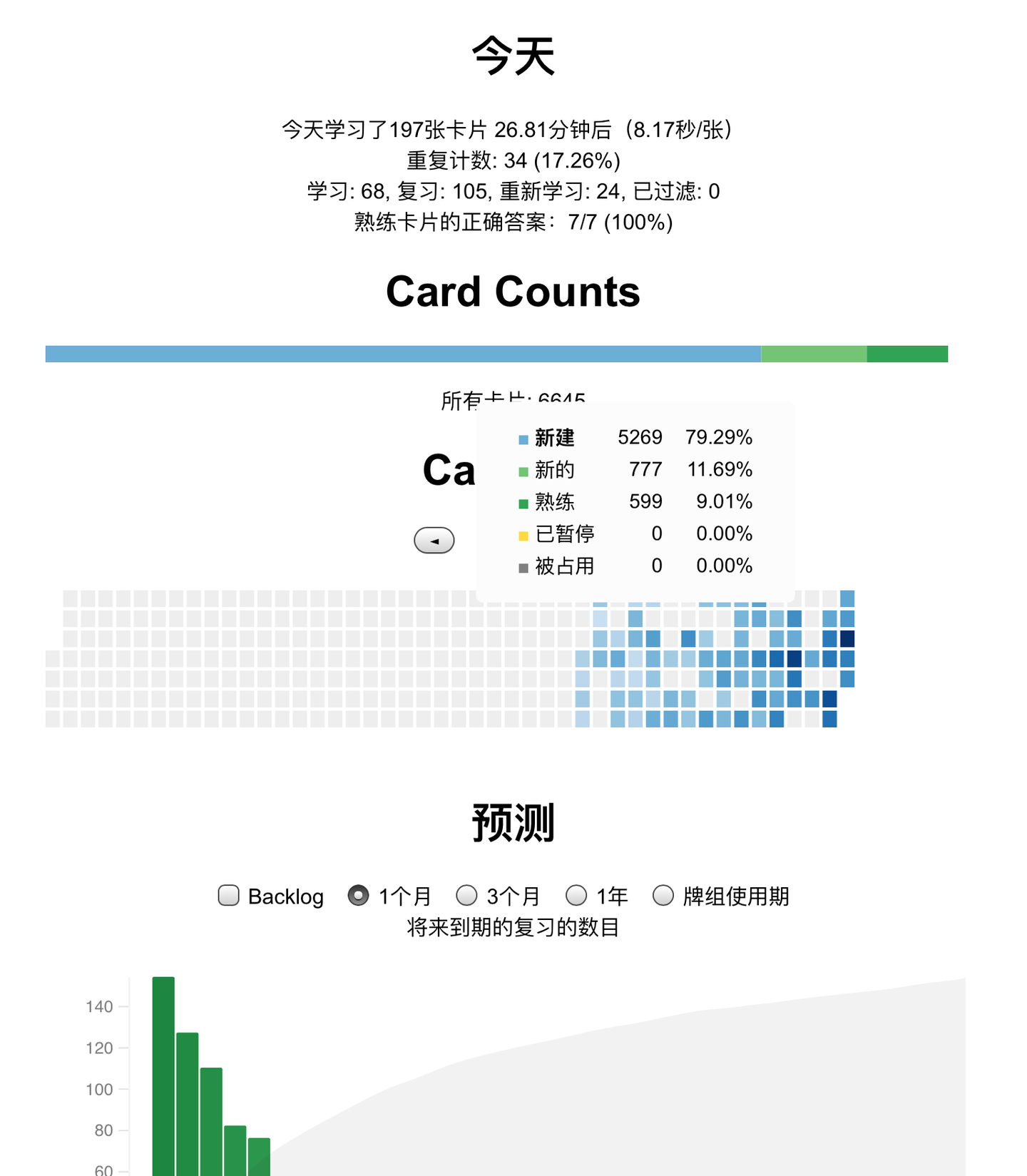 被占用:被搁置的卡片数量(被搁置的卡片会自动在第二天加入复习)
