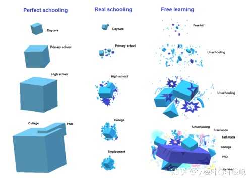 图:在完美的学校教育中,我们创造了完美的知识结晶。在大学里,我们又多了一块专业化的水晶。然而,在现实中,学习看起来并不那么完美。对于大多数孩子来说,知识从来没有建立足够的连贯性,并且由于干扰(即快速遗忘)而支离破碎。因此,在现实的学校教育中,知识渐近达到一定的数量,并从那一刻起就不断地翻滚,在稳定性和连贯性方面几乎没有进展。相反,在自由学习中,知识的获取是混乱和不均衡的。但是,只要它是基于学习内驱力,知识量是非常大的。知识的单个晶体相互碰撞,并建立一致性和连贯性。这反过来又有助于知识的稳定和进一步整合。到了大学时,就体积而言,自由学习者应该比普通学生知道的要多得多。自由知识有多方面的长处,也有多方面的弱点。然而,它在连贯性方面更优越。这就是为什么它更适用于解决问题