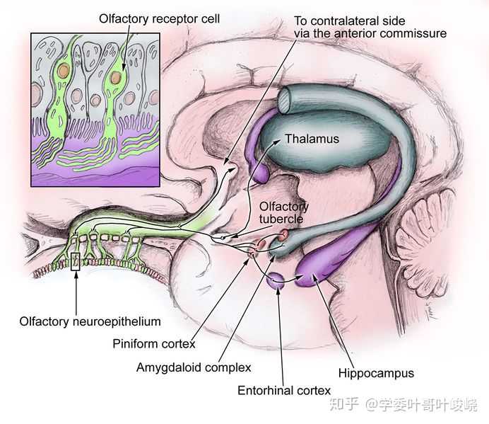图:嗅觉系统解剖学。嗅觉信号可以通过嗅球、嗅结节、小齿轮状皮层和鼻内皮层的几个突触快速到达海马体。(来源:维基百科)