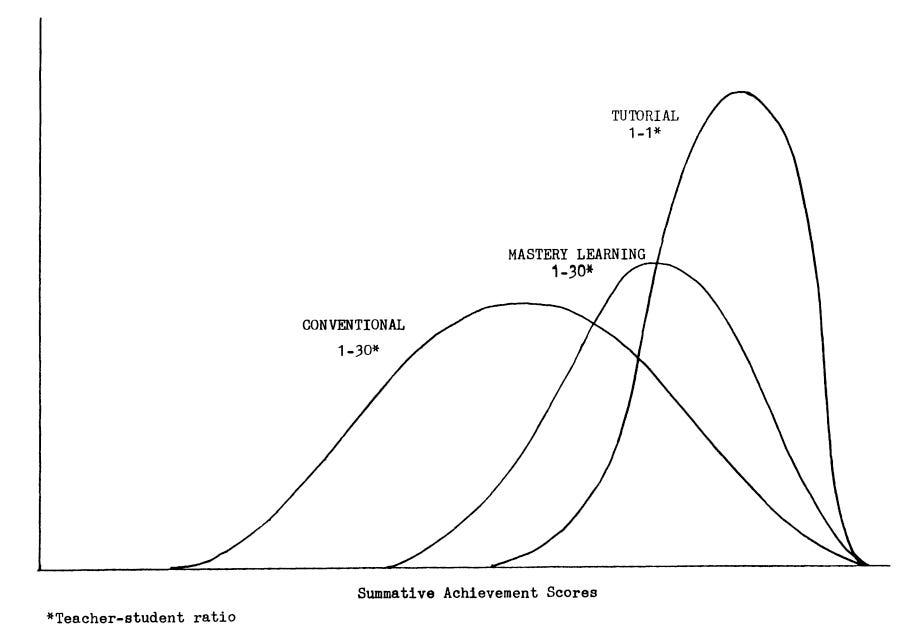 Bloom 绘制了这张简洁明了的图表,展示了采用不同教学方式下学生成绩的分布情况。这张图表看起来似乎是基于严谨的数据分析,而不是凭直觉绘制的。
