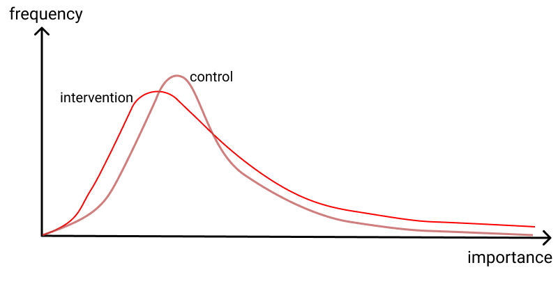 如果干预在典型行为中表现更差,那么对于一个小规模试验,干预I将显得比对照 C 更差,因为样本数量少得多意味着II从重尾性中获益的机会大大减少。这并不是说现有方法 C 实际上更好。而是它拥有巨大的规模,这意味着它能够从偶尔的异常结果中获益。相比之下,干预 I 的获益机会相对较少;如果它拥有相似的规模,异常值将比 C 更为显著。换句话说:在重尾系统中,你获得的「射门次数」至关重要。