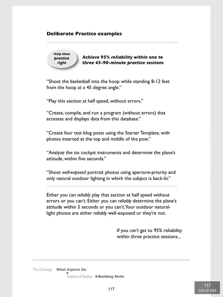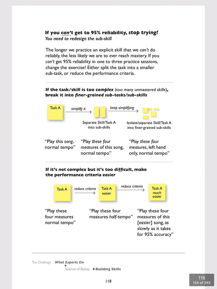第四,缺乏进步感或动力不足——这与上述前两个问题(子技能定义不清、缺乏反馈)有关,源于人类学习的本质规律。我们只能学习那些我们已经准备好学习的技能,因此,如果没有教练指导,我们常常会因为无法按正确的顺序挑选难度适中的子技能而陷入瓶颈期。对此,我(迄今为止)发现的最佳解决方法,源自 Kathy Sierra 的 Badass: Making Users Awesome 一书中的方案,该书提供了一种简化版的刻意练习形式,详见下方截图: