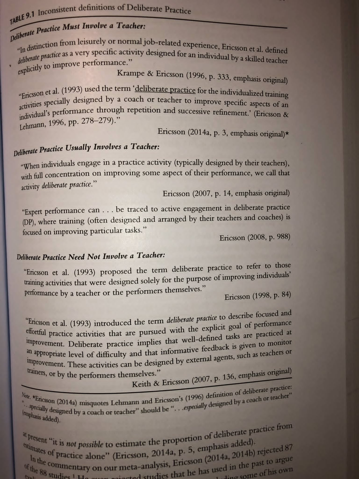 Hambrick 对各种描述的汇编很好地解释了我对这个概念的困惑——这些年来我阅读过许多关于刻意练习的相互矛盾的解释,从未真正确定 Ericsson 的确切定义。当然,这可能是因为 Ericsson 在研究过程中不断发展和完善他的理论。例如,在《刻意练习》一书中,他认为刻意练习的原则是普遍适用的——无论是否有老师指导。