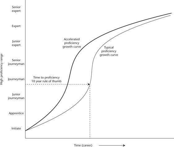他们审慎地得出结论,或许我们只能加速从高级学徒到初级熟手(或从高级熟手到初级专家)这一阶段的熟练度提升。他们展示了如下所示的理想化成长曲线: