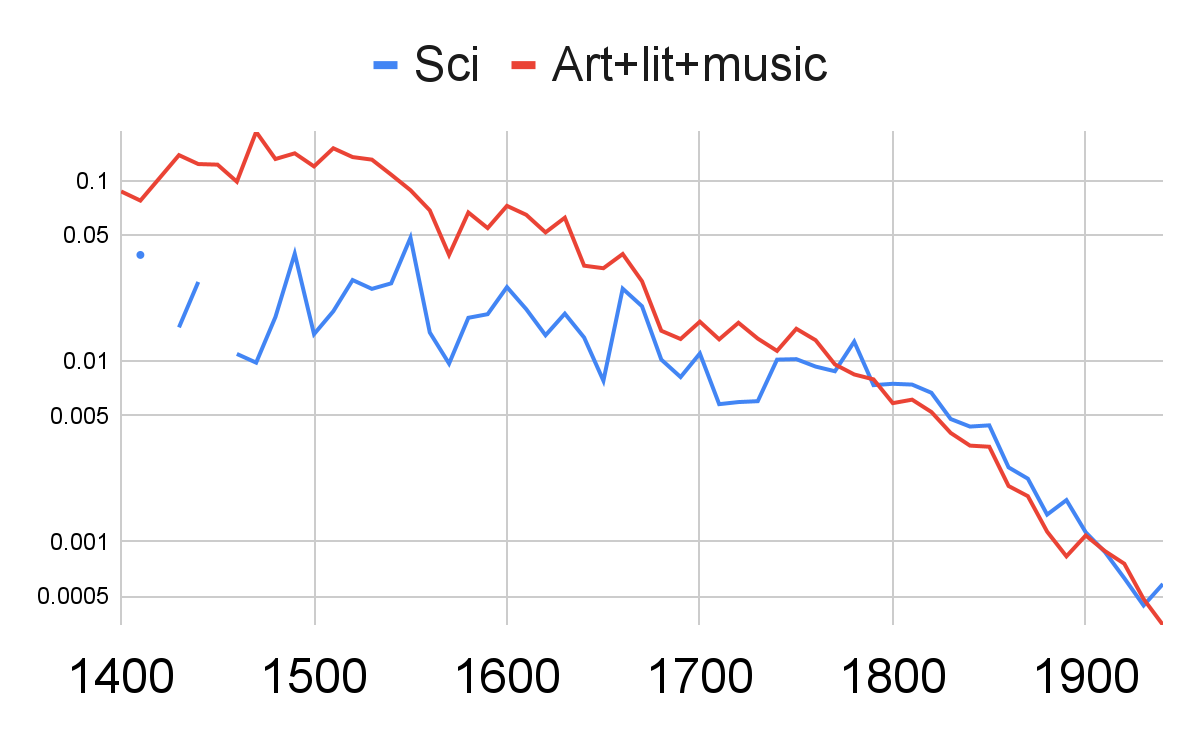 如果你不同意,我当然承认要为天才的衰落找到无可辩驳的证据是困难的——智力贡献极难量化,天才的定义总是存在争议,而且任何讨论都必然会回避各种观点和反驳。但至少乍看之下,数据似乎支持了这种坊间说法。以下是 Cold Takes 博客文章《今天的贝多芬在哪里??》中的一张图表。在下图中,我们可以看到备受赞誉的科学家(蓝色)和艺术家(红色)的数量,除以有效人口(指拥有教育和渠道能够为这些领域做出贡献的总人口)。