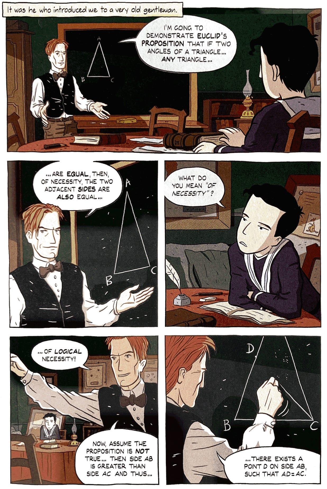 贵族式辅导跨越了不同王国和大陆,持续了数千年之久。如果我们将时间快进近 2000 年,我们会看到伯特兰·罗素,20 世纪无可争议的天才之一,他正是贵族式辅导的典型案例——由富有的祖父母抚养长大,他直到 16 岁才开始正式上学,并且拥有一系列轮换的导师,其数量堪比马可·奥勒留。其中许多人本身就是杰出的科学家和知识分子,例如,罗素的一位导师 J. 斯图尔特(J. Stuart),他本人就曾是开尔文勋爵(Lord Kelvin)(就是那个「开尔文」温标的命名者)的学生。罗素,得益于他详尽的自传,让我们得以清晰地了解贵族式辅导究竟是怎样的。以下摘自罗素生平的图像小说改编版 Logicomix: