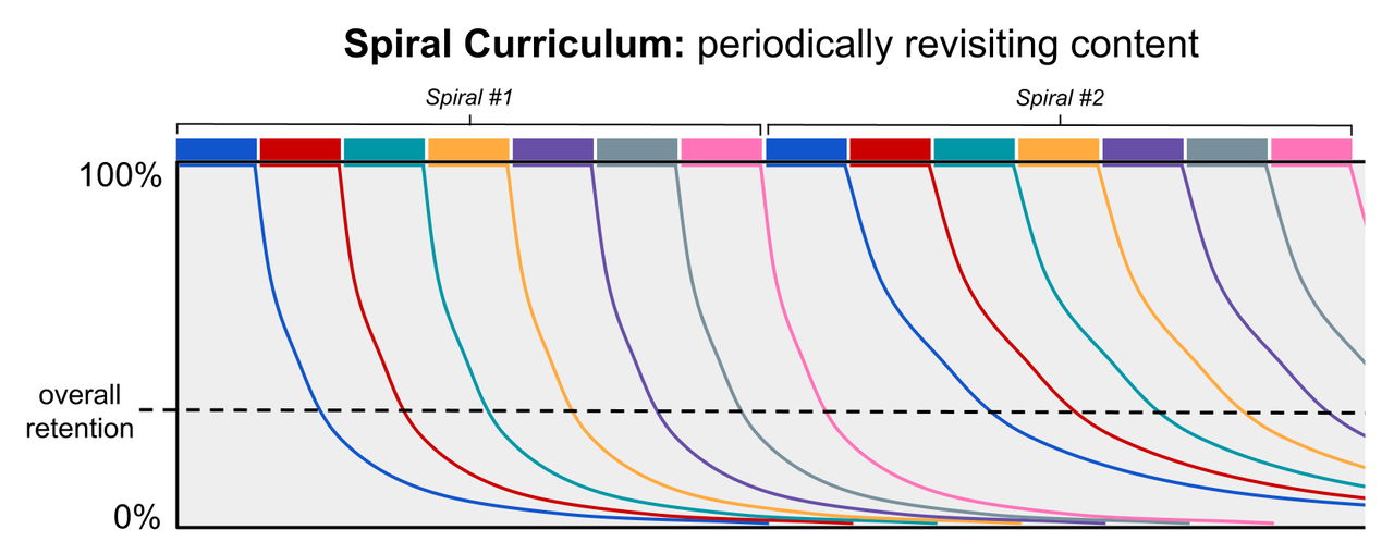 一些课程采用螺旋式教学方法,在后续的教材章节和/或年级中自然地重温和深化学习内容。与缺乏系统性复习的传统教学模式相比,螺旋式教学显然是一种改进——它允许教师在没有技术辅助的情况下,在小组层面进行手动教学时,在某种程度上利用间隔效应。然而,螺旋式教学仍未达到实现真正间隔重复最大效益所需的细致、精确和个性化水平。