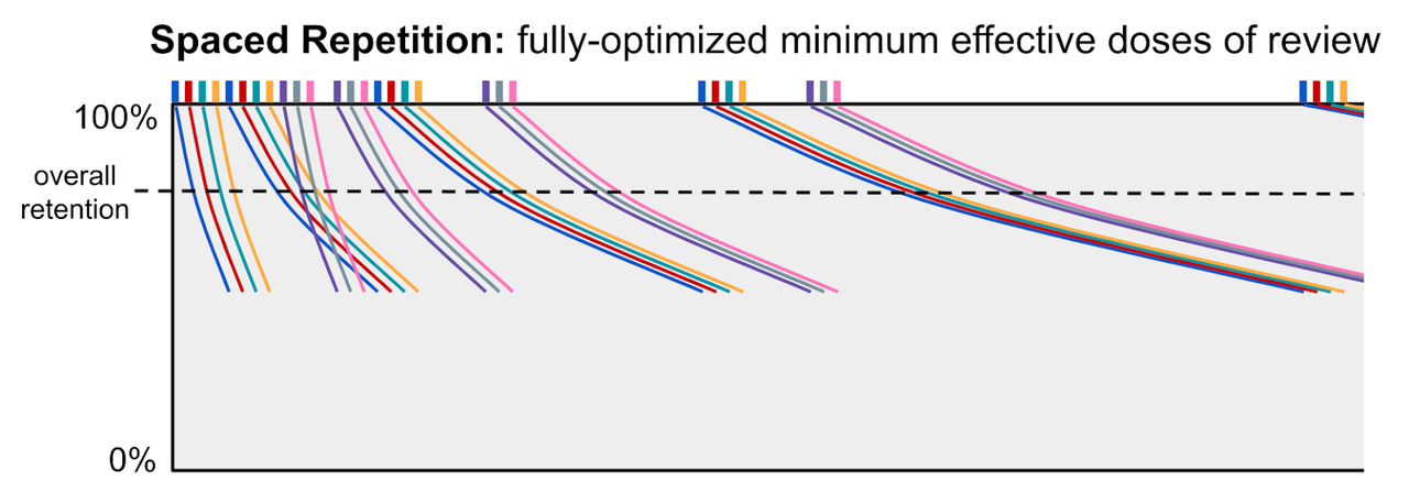 - 通过巧妙选择复习内容(包括新课程),使其隐式的重复能像多米诺骨牌效应一样连锁「触发」其他待复习内容,从而最大限度地减少所需的复习次数,并且