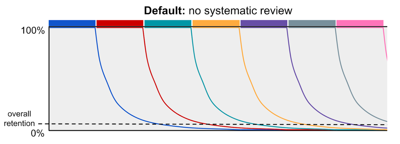 要理解螺旋式教学与间隔重复之间的区别,最好从遗忘曲线的角度来进行可视化比较。我们从传统的教学模式开始,其中大量相关材料一次性教授,而之后并没有系统性地复习。在这种教学模式下,学生很快就会遗忘所学内容,他们的整体记忆保持率极低。