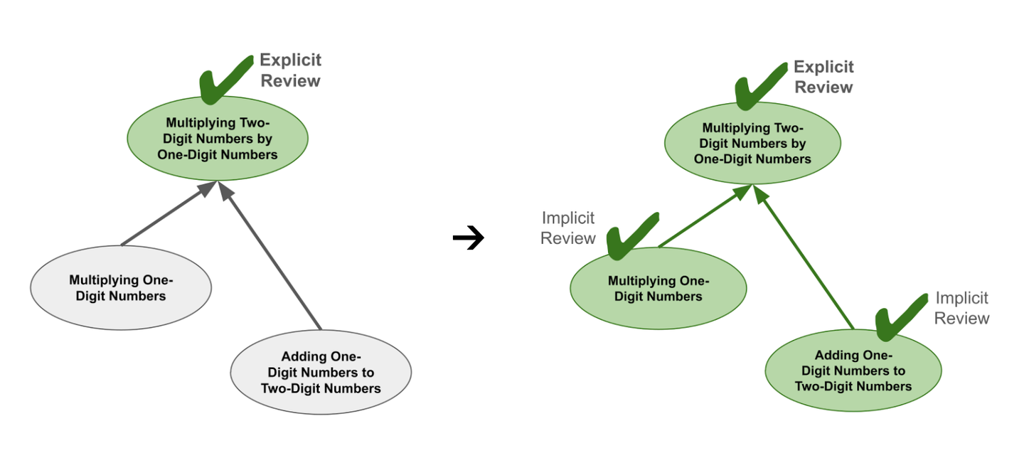 现在,假设一个学生需要复习这三个主题。由于知识间存在包含关系,他们实际上只需要复习「两位数乘以一位数」这一主题。当完成这个复习时,学生也在练习了这些技能,从而隐式重复了其包含的主题。