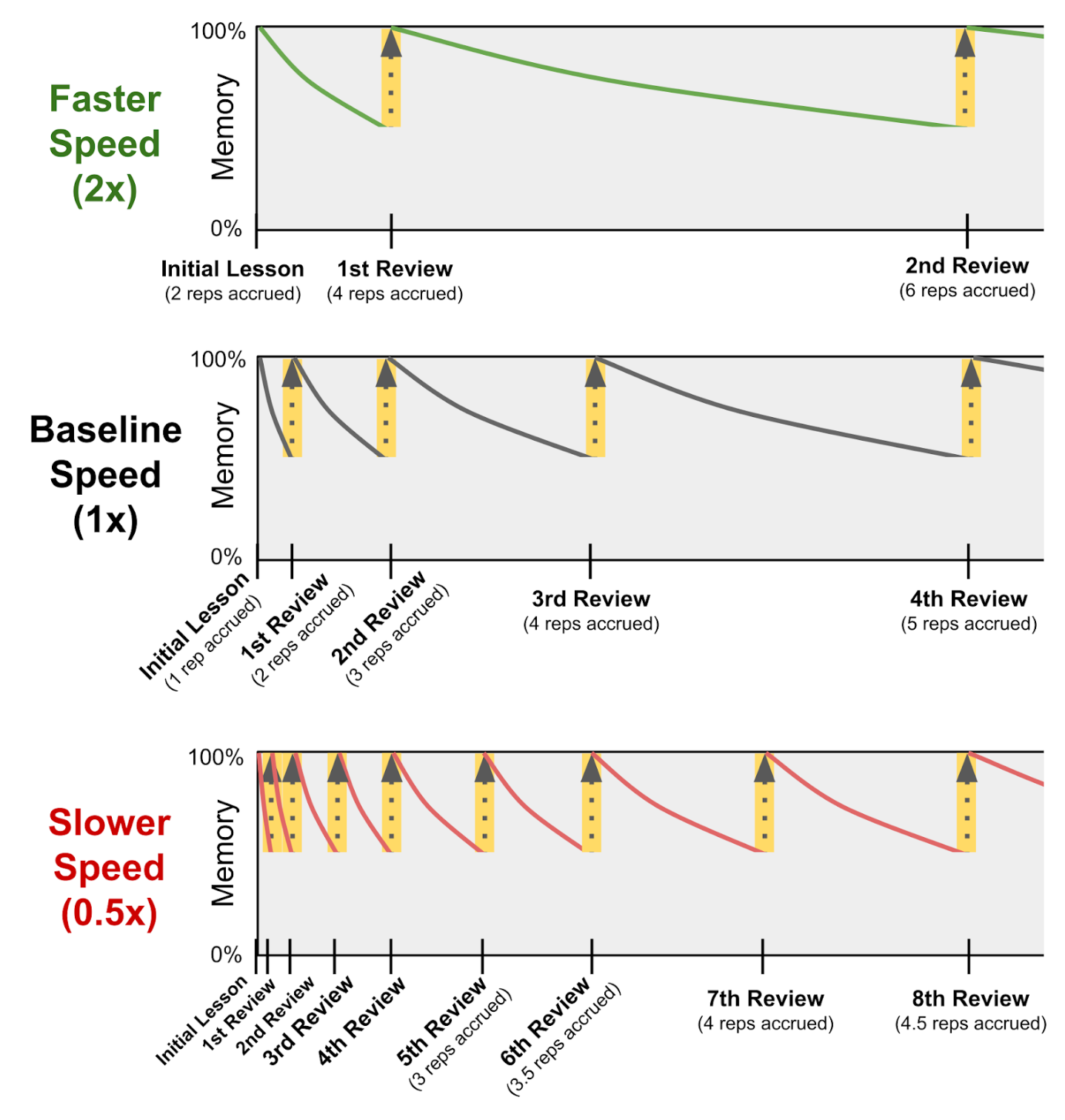 - 举个例子,假设一个学生在某个主题上的学习速度是标准速度的 2 倍,那么他在这个主题上完成的一次复习就会被系统认为相当于完成了两次标准的间隔重复。