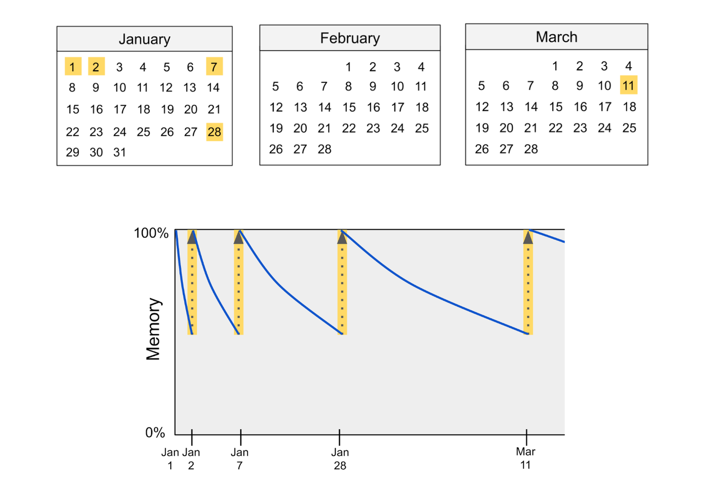 通过定期重温内容,螺旋式课程能够恢复被遗忘的知识,并利用间隔效应来减缓知识的流失。这提高了学生对所学内容的整体记忆力。为说明这一点,下面展示了一个具有两个螺旋的螺旋课程的遗忘曲线: