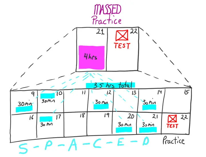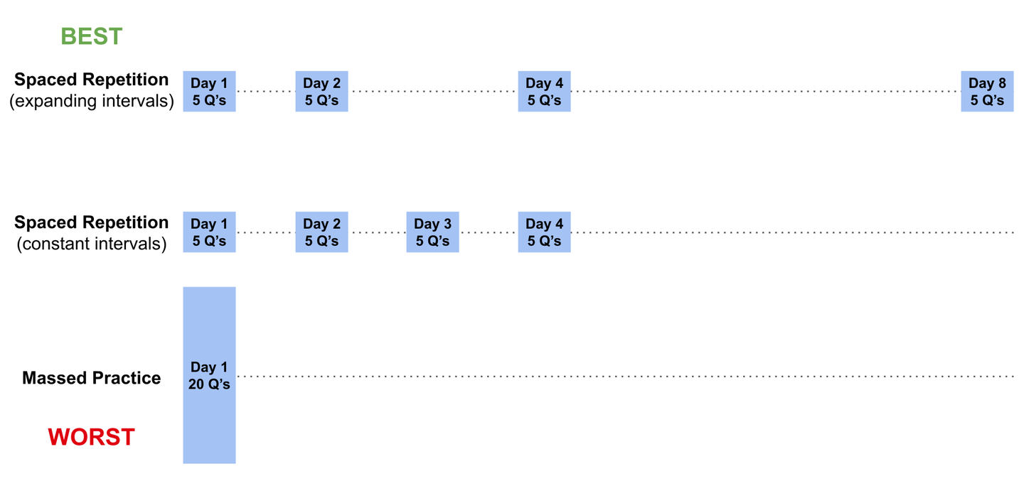 重要性:当我们将复习分散到多个时段(而非集中在单一时段内)时,不仅能恢复记忆,还能将其进一步巩固到长期记忆中,从而减缓遗忘。这种现象被称为间隔效应。 - Kang, S. H. (2016). Spaced repetition promotes efficient and effective learning: Policy implications for instruction. Policy Insights from the Behavioral and Brain Sciences, 3(1), 12-19.