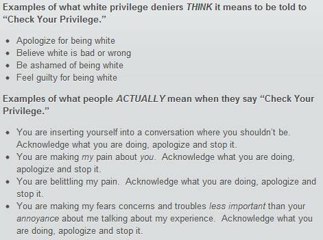 否认白人特权者认为被告知要「反思你的特权」时,他们所想到的含义示例:
