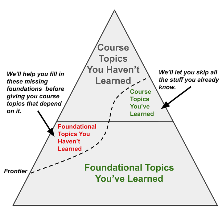 新生在进入某一课程时,常常会缺乏一些必要的基础知识。在传统课堂中,这可能意味着学习失败。但在 Math Academy,我们能够评估学生的知识边界,即使它低于课程水平。我们能帮助学生填补缺失的基础知识,同时允许他们学习那些不依赖于所缺基础的课程主题。