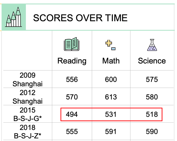 从 PISA 数据来看,2015 年的成绩显著低于其他年份。对比 2015 和 2018,广东被替换成了浙江,分数大幅提高到接近之前上海单独参加的水平。而 2015 年对比 2012 年,加入了北京、江苏和广东,分数大幅下降,谁背锅,不用我说了吧?至少广东是落后于上海、北京和江苏的。