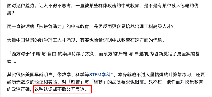 再谈谈 STEM 教育。这些科目确实需要坚实的基础技能练习。但是说他们不敢公开表达,真有点尬黑了。
