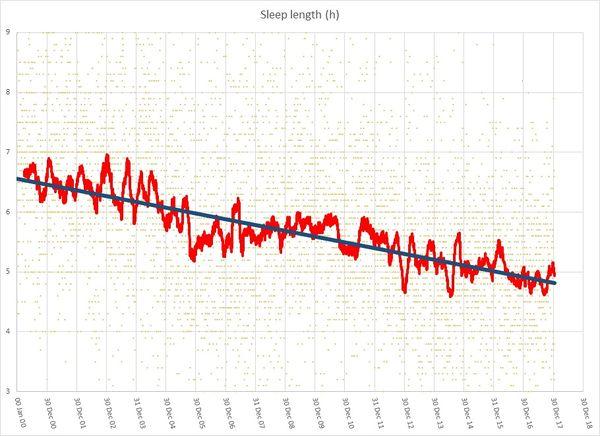 图:二十年来夜间睡眠的平均时长呈下降趋势(Wozniak 2000-2017)