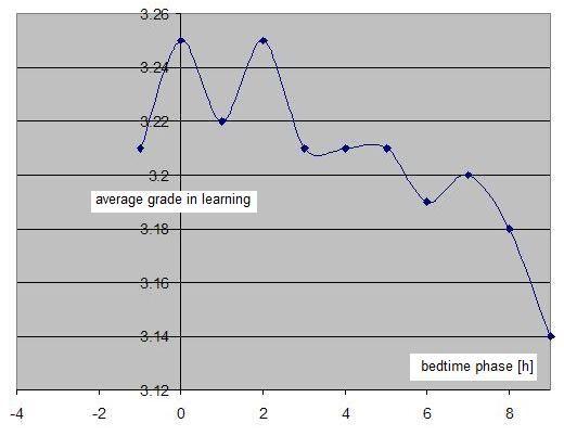 就寝相位与学习表现的关系。就寝相位指实际就寝时间与最佳就寝时间之间的差异。学习表现则通过使用 SuperMemo 学习时获得的平均评分来衡量。
