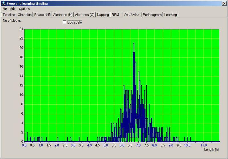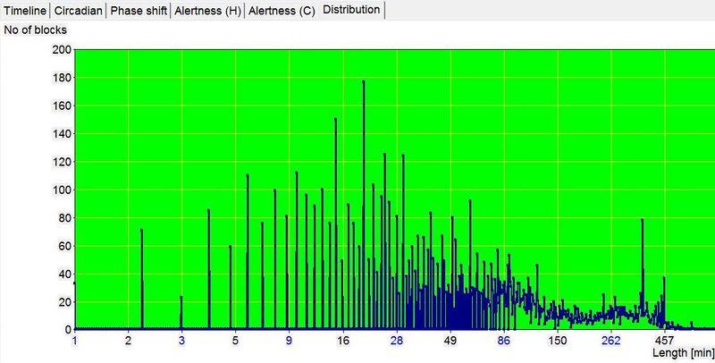 SleepChart 可以展示所有睡眠时长的分布情况。这一分布数据可以用来反驳睡眠时长集中在 90 分钟整数倍的说法。在所给的例子中,一位单相睡眠者的睡眠时长确实在1、2、3、3.5、4、5、6、7、8、9 和 10 小时处出现了聚集现象。然而,仔细分析后发现,这种聚集现象仅仅是由于受试者记录不够精确造成的(比如更倾向于记录 3.0 小时而非 2.95 小时)。实际上,并没有发现明显的 90 分钟周期趋势,反而可能会让人误以为存在 60 分钟的周期性。