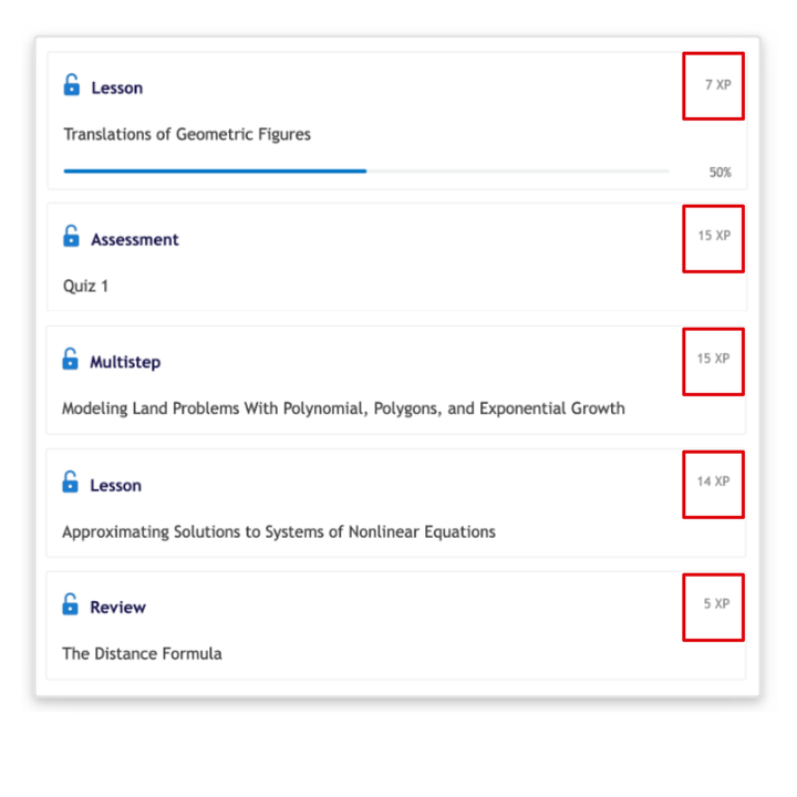 为激励学生练得多,练得精,Math Academy 基于经验点(XP)实现了游戏化的奖励系统。学生成功完成学习任务即可获得 XP,而 1XP 相当于平均认真程度(但并不完美)的学生在 1 分钟内全神贯注、高效学习所取得的成果。