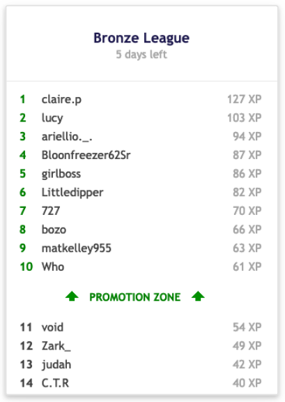 比如,为了激励学生完成足够量的学习,我们实现了(可选的)周排行榜。能力相当的学生被划分到同一个段位。如果一周结束时学生拿到足够多的 XP,在自己的段落名列前茅,他们就会升到更高的段位。但如果一周结束时他们位于段位底部,他们就会降到更低的段位。