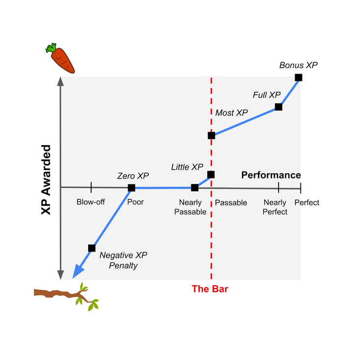 同样地,为了激励学生保持高质量的学习,我们设计了一个灵活的 XP 奖励机制。这种机制为卓越表现(与「差不多就行」相反)提供丰厚奖励。学生需要达到一定标准才能获得额外的 XP。这和传统的总百分比分数形成鲜明对比,后者往往对超额完成任务的学生奖励有限,同时又允许表现欠佳的学生「得过且过」。