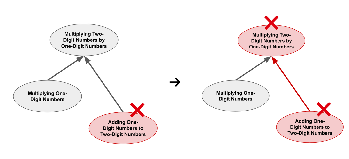 让我们用一个具体例子来阐述这个概念。请回想一下,「两位数乘一位数」这个技能实际上包含了「一位数相乘」和「一位数加两位数」这两个基础技能。