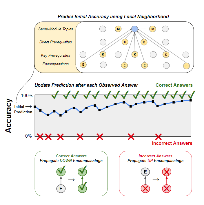 为了确定一个主题准确率的初始值,我们会基于该主题的局部关联网络进行预测,这个网络包括其直接前置知识、关键前置知识、上层包含关系以及同一模块中的相关主题。