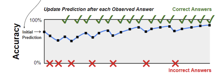 学生能力是在单个具体主题的精细层面上进行测量的——我们会追踪学生答题的准确率,对近期答题结果给予更高权重,并且还会进行能力评估的传播: