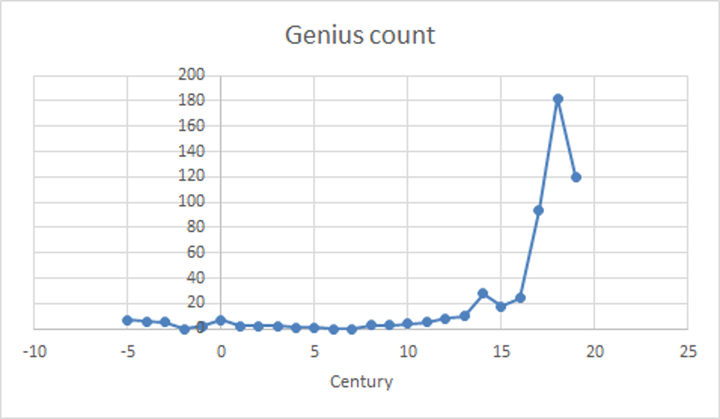 这个特定的数据集截止于 1950 年,但下降趋势已经非常明显。而《奇怪的循环卡农》则根据维基百科的提及次数整理了这张关于天才的图表。