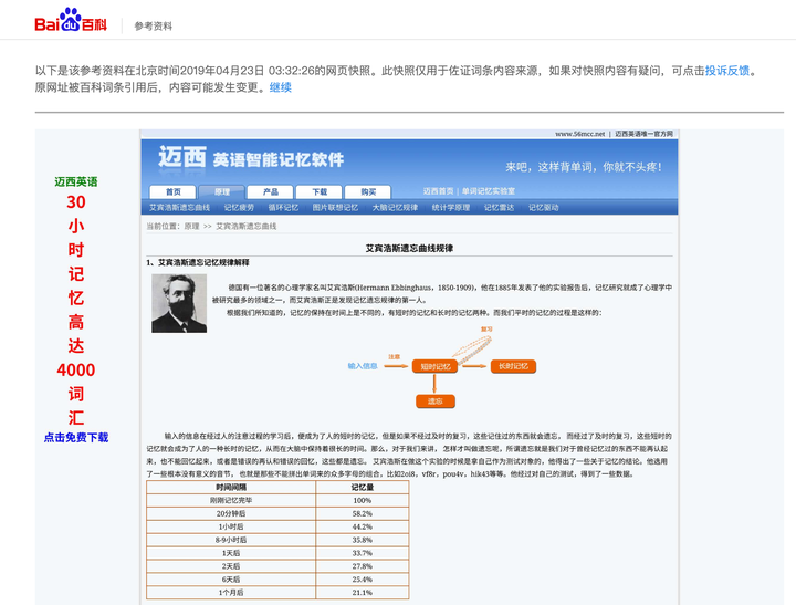 关于艾宾浩斯的谣传在中文互联网上已经延续了二十几年甚至十几年,现在依然还有很多人误以为这套记忆周期是艾宾浩斯发明的。比如著名中文网络百科全书就有这么一个词条: