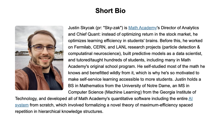 更短:Justin Skycak(发音:"Sky-zak")是 Math Academy 的分析总监。他负责为 Math Academy 开发所有用于实现自适应、高效、全自动化学习的量化软件。他的专业背景涵盖粒子探测与计算神经科学研究、行业数据科学经验,以及向包括 Math Academy 早期学校项目众多学生在内的数百名学生教授数学的经历。他所掌握的大部分数学知识均通过自学获得,并从中受益匪浅,这正是他如此积极地致力于让更多学生能够进行自主学习的根本原因。